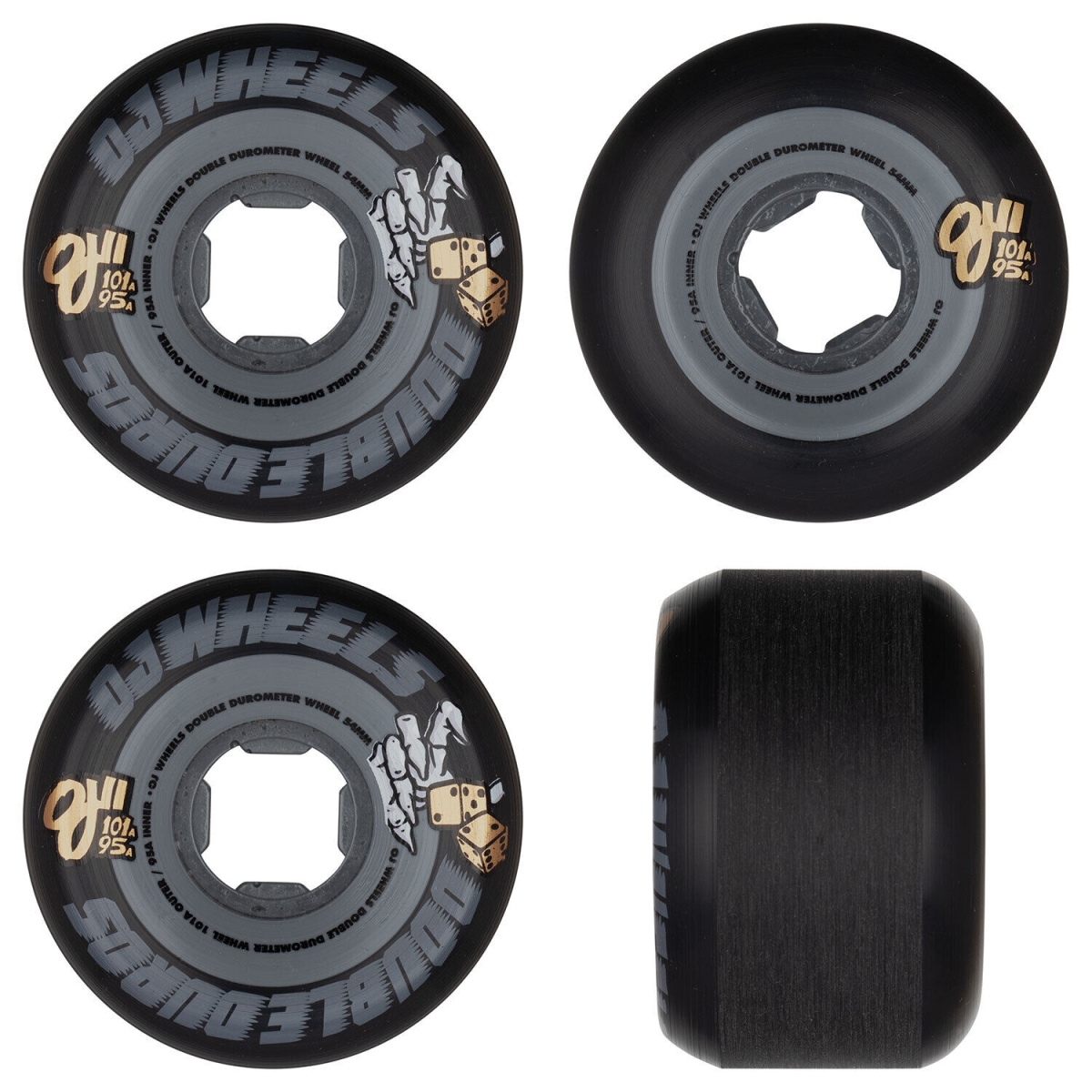 Double Duros are a new approach to wheel design and manufacturing from OJ Wheels featuring a 101a outer durometer wrapped around a 95a inner durometer.